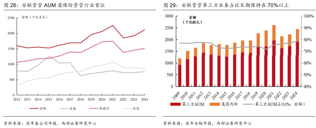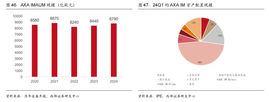 领先的综合性保险集团,资管业务以险资为主。安盛集团主要经营财产险、寿险、健康险和资产管理四项核心业务。业务网络覆盖50个国家和地区,服务近1亿客户,员工约15万人。AB(Alliance Bernstein,联博基金)和AXA IM(AXA Investment Managers,安盛投资管理)曾是安盛集团的资管机构,分别于2019年和2025年剥离。从2024年数据看,AXA IM管理资产8790亿欧元,其中险资是AUM主要的组成部分,2024Q1集团内险资占比约48%。