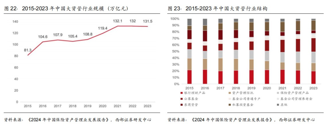我国大资管行业规模超131万亿,产品分化较大。我国大资管行业的范畴主要包括:银行理财产品、资产管理信托、保险资产管理公司专户及产品业务,以及证券、基金、期货等公司及其子公司发行的资产管理产品等。规模方面:截至2023年末,中国资产管理行业总规模超131万亿元,2015-2023复合增速为6.2%,2021年以来规模走平。产品方面:2023年银行理财、资产管理信托、保险资管产品、公募基金占比超70%;其中,公募基金、私募基金增速较快;信托和券商资产管理规模增速明显放缓、占比有所下滑。
