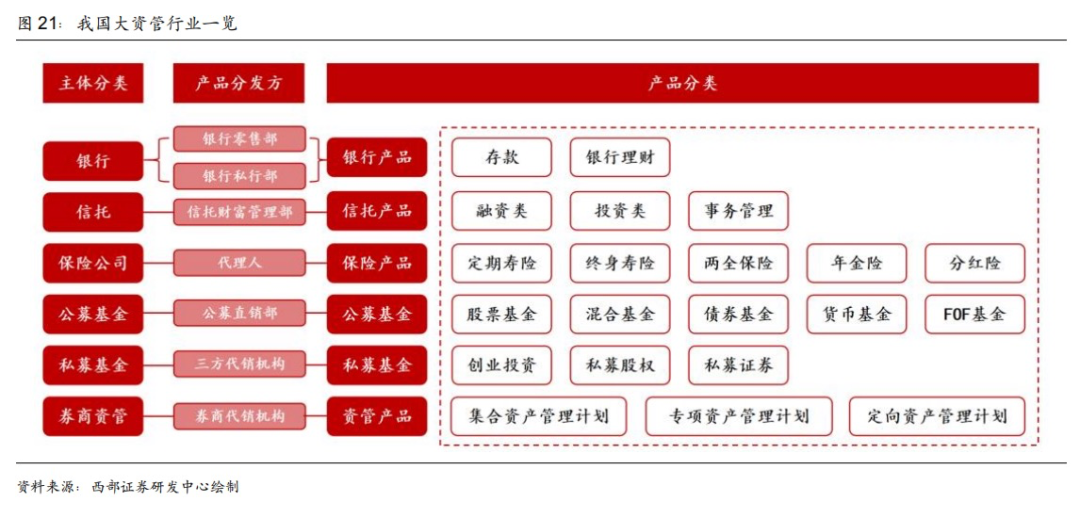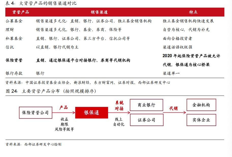 公募、理财、私募等销售渠道多元化,保险资管以银保通为主。当前大资管产品的主要包括公募基金、理财产品、私募基金、信托产品、保险资管以及银行存款等。各渠道特点鲜明:公募基金通过多元化销售渠道迅速扩张;理财产品以银行自营为核心,辅以代销;私募基金则通过直销、银行、证券公司等多渠道进行销售;信托产品主要依赖直销和银行代销;保险资管产品以直销为主,自2020年起允许代销,银保通平台成为连接银行、券商等代销机构的核心桥梁。银保通平台在保险资管代销业务中有着关键作用,通过系统对接和线上自动化,实现了产品信息在商业银行、证券公司与金融机构之间的高效传递。