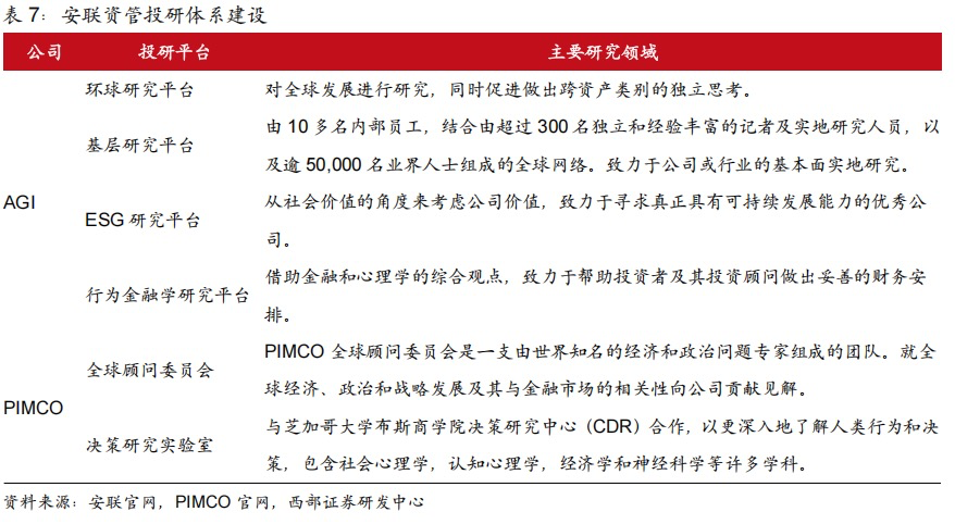 2)投研能力强大:模块化投资体系,PIMCO以主动固收管理见长,AGI以多元大类资产配置见长,并基于公司数字化发展战略,整合了全球各地投资团队积累的长期投资经验与数据。