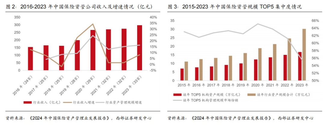 我国保险资管行业收入及管理规模稳步增长。截至2023年末,33家保险资管公司实现收入合计296.6亿元,同比增速8.2%;资产管理规模同比增速16.3%。近年来行业集中度有所下滑。2015年以来,行业资产管理规模排名前5的机构市场份额约占六成,但规模集中度近年来呈明显下降趋势,2023年首次降低至60%以下。