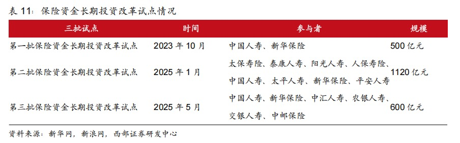 政策鼓励保险机构积极参与长期股票投资试点,通过设立私募股权基金投资二级市场股票并长期持有,保险资管公司深度参与。三批保险资金长期投资改革试点已全部批准。2023年10月,金融监管总局批复同意中国人寿和新华保险通过募集保险资金试点发起设立证券投资基金“鸿鹄基金”。截至2025年5月,三批保险资金长期投资改革试点已全部批准(共计2220亿元)。“鸿鹄基金”作为证券投资基金代表,主要投向关系国计民生的重点行业,通过锚定大盘蓝筹股实现资产负债久期匹配,构建穿越周期的投资框架。第三批试点由国寿和新华引领,中汇人寿、农银人寿、交银人寿、中邮保险等中小公司参与,服务于符合国家需求的新质生产力和高质量发展产业,促进险企实现长期、稳定、可持续的投资收益。