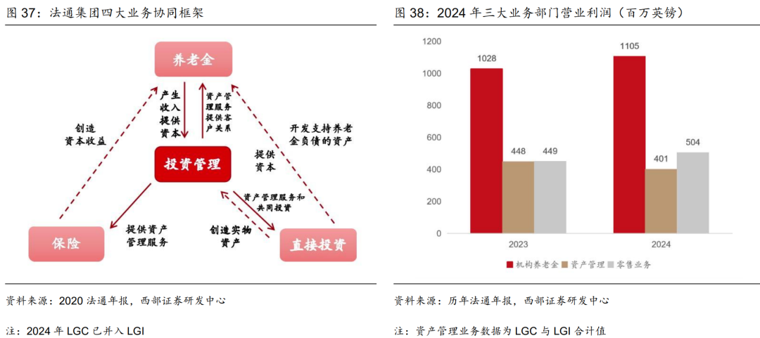 集团四大业务高度协调,资管业务为核心。法通集团中保险(LGI)、养老金(LGR)、直接投资(LGC)、资管(LGIM)高度协同。其中,资管业务是法通集团业务闭环的核心,养老金为资管业务提供AUM、为直接投资提供资本,直接投资为资管业务提供另类资产;而资管业务为养老金、保险和直接投资提供资管服务,并开展共同投资。2024年LGI与LGC合并形成集团统一的资产管理部门,增强协同效应。