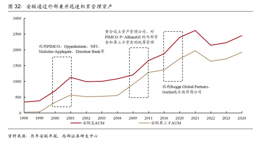 关键节点:吸收两大第三方资管子公司PIMCO(美国太平洋资管公司)和AGI(安联国际投资者)。2000年收购PIMCO,2001年收购Dresdner Bank(旗下资产管理部门是AGI前身),PIMCO长期搭建与银行、信托、券商、保险等机构的多元合作渠道;AGI积极践行全球化、零售化的战略,因此客户覆盖了全球各类养老基金、跨国大企业、慈善基金、家庭、个人客户及财务顾问等。