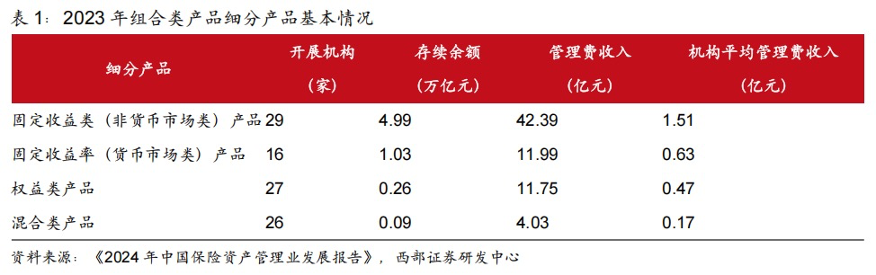 投资资产以固收为主,细分产品中,固定收益类占据领先地位。2023年末,投资资产规模前两位为存款、债券,合计占比86%;其次为股票,占比5%,而非金融企业债务融资工具、证券投资基金、买入返售金融资产等占比均低于3%。细分产品中,固定收益类产品(非货币市场类)产品开展的机构最多,存续余额和管理费收入均最高,且机构平均管理费收入最高为1.51亿元。