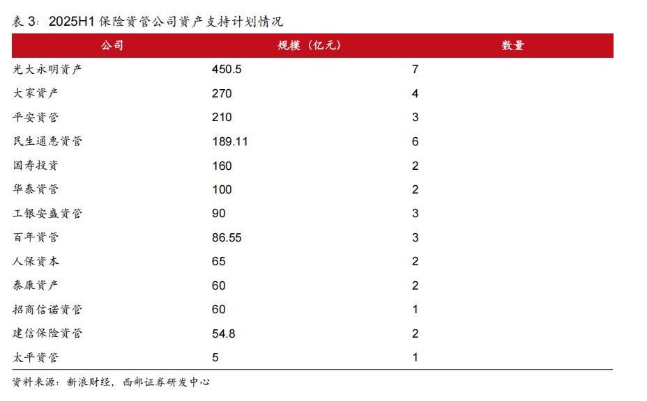 经济由“增量扩张”迈向“存量活化”,保险ABS迎来机遇。2012年10月,原保监会发布的《关于保险资金投资有关金融产品的通知》首次规定,保险资金可投资于保险资管公司发行的“项目资产支持计划”,拉开了保险行业试点ABS的帷幕。2021年资产支持计划的设立程序由注册制改为登记制,自此快速增长,2025H1总规模达1801.0亿元,较2024年同期同比上升46.1%。从规模总量看,平安资管以2562.1亿元的规模遥遥领先,是唯一一家规模达到两千亿以上的保险资管。2025H1,光大永明资产资产支持计划、大家资产、民生通惠资管等资产支持计划规模崛起,与平安资管差距显著缩小。