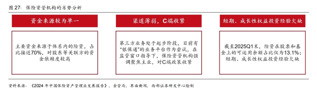 3)在短期、成长性权益投资方面经验较为欠缺。仓位方面,险资投资在股票上的仓位较小,截至2025Q1末,险资在股票和基金上的可运用余额占比仅为13.1%,而债券+存款的可运用余额占比达到59.4%;投研能力,保险资管在固定收益和长期稳健型权益资产配置方面具有专业化的管理能力和丰富的管理经验,但是在短期成长性权益类投资经验方面相对欠缺。