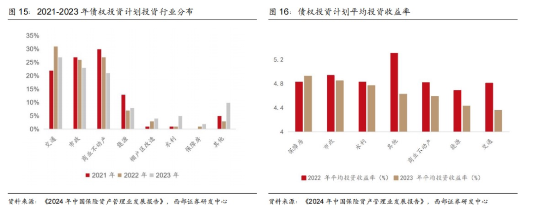 债权投资计划的投资资产以固收为主,投资收益率明显下降。债权投资计划主要投资于交通、能源、水利等实体项目,凭借单笔规模大、期限长、稳定性好等优势,为险资连接实体经济提供重要途径。2023年登记的债权投资计划,其登记时点的平均投资收益率为4.65%,较2022年降低24个基点,投资收益率连续三年下降。行业方面,2023年排名前三的为保障房、市政、水利类;投资期限方面,2023年登记产品平均投资期限为7.27年,同比增加0.18年。行业方面,基础设施类产品期限长于非基础设施类,排名前三的为交通、水利、市政类。