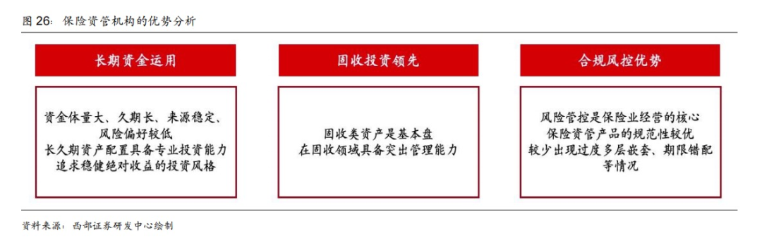 1)在长期资金运用上具有先发优势,擅长大类资产配置。我国保险资管管理的资金仍以系统内险资为主,具备资金体量大、久期长、来源相对稳定、风险偏好较低等特点。经历多年实践,保险资管公司对险资的负债属性、风险偏好、收益要求、投资方向与行业监管政策等方面积累了丰富的经验,尤其在长久期权益/固收资产的配置方面形成了专业化的投资能力。相比银行、证券等机构,保险资管公司可以从久期、收益、成本、流动性、风险等多方面综合考量为长期资金匹配更加合适的资产,大类资产配置能力相对较优。