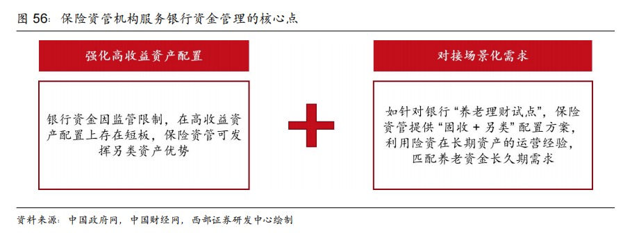 在保险资管的组合类产品中,商业银行尤其偏好固收类产品,在非货币市场类和货币市场类中占比均高于70%,但在权益类和混合类产品中占比较低。由于银行资金因监管限制,在高收益资产配置上存在短板,因此保险资管保持固收投资优势的同时,可在权益投资方面继续发力:1)提供长周期稳健型权益配置选择:凭借保险资管长久期稳健资产配置能力,尤其是高股息资产的权益研究能力,为银行提供多元化选择;2)提供定制化解决方案,对接银行场景化需求。如针对银行“养老理财试点”,保险资管提供“固收+另类”配置方案,利用险资在长期资产的运营经验,匹配养老资金长久期需求。