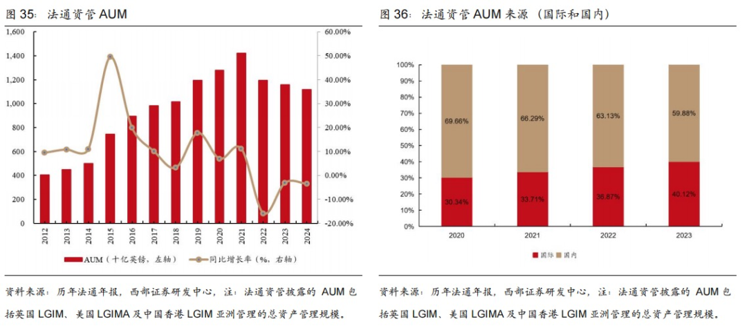 业务规模庞大,三方业务注重养老金和国际化。截至2024年底,AUM为1.12万亿英镑,同比下降3.5%。法通退休金事业部(LGRI)是英国提供团体年金最悠久的机构,英国机构资产占据主导地位,国际资产占比增速逐年提高。2023年国际资产规模达到4650亿英镑,同比增长5.4%;国际资产占外部资产比例为40.1%,自2016年起该比例持续上升。