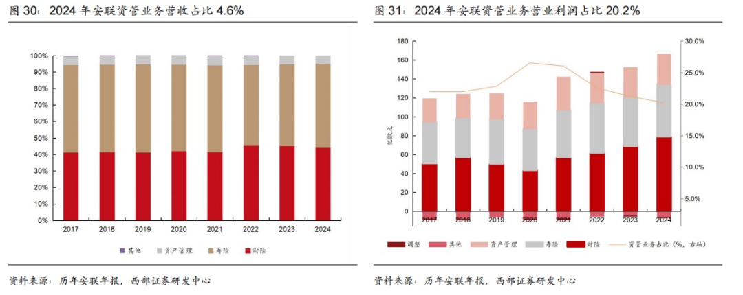 第三方业务加持下管理费率提升,对集团利润贡献度较好。2020-2022年安联管理费率呈上升趋势,从0.29%升至0.36%,2023年和2024年管理费率均高于0.30%,得益于第三方业务占比较高,安联定价能力保持稳定,维持在较高水平。资管营收稳步提升,利润转化率较高:截止2024年末,资管业务实现营收83.24亿欧元,占安联集团总营收的4.6%,实现营业利润32.39亿欧元,占集团 20.2%的比重,利润转化率较高。