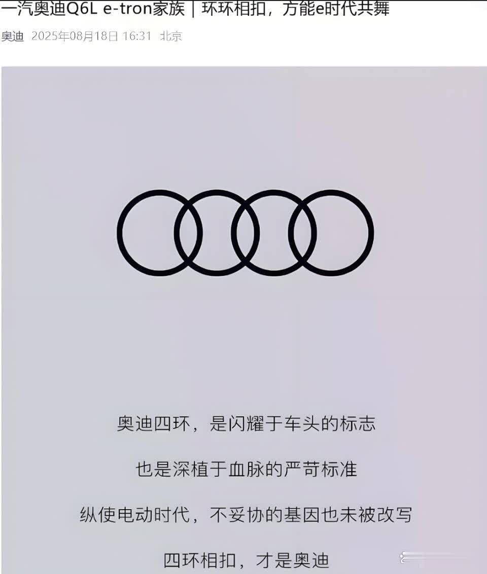 几乎在同一时间,一汽奥迪Q6L e-tron家族上市。其官方公众号发布题为“四环相扣,才是奥迪”的推文。尽管文中未直接提及上汽奥迪或AUDI新品牌,但业界普遍解读此举为一汽奥迪对“品牌正统性”的宣示,暗示只有搭载四环标志的奥迪才是“真奥迪”。