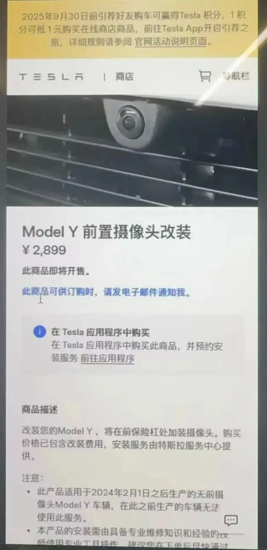 整体来看,Model Y的前机盖流线设计好看是好看,但盲区也是真的大,再加上特斯拉早就砍掉了前方雷达,所以前置摄像头其实是一个非常好用的配置。所以你的Model Y在可升级名单里吗?如果刚好能装,这2899元你觉得花得值吗?来评论区聊聊你的看法。