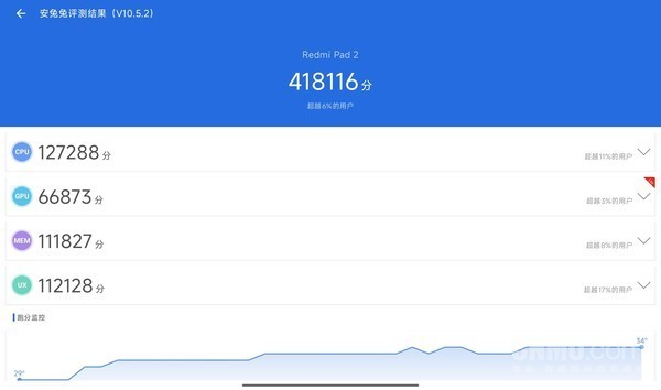 配置方面,REDMI Pad 2在核心的SoC上采用的是联发科G100-Ultra处理器,最高频率为2.2GHz,实测安兔兔跑分41万+,这样的性能表现虽然与旗舰产品相差甚远,但对于一款学习取向的平板来说,的确是不需要太强的性能实力,因此REDMI Pad 2在这方面的表现恰如其分。