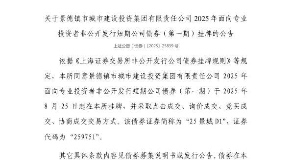 8月22日,上交所发布关于景德镇市城市建设投资集团有限责任公司2025年面向专业投资者非公开发行短期公司债券(第一期)挂牌的公告。