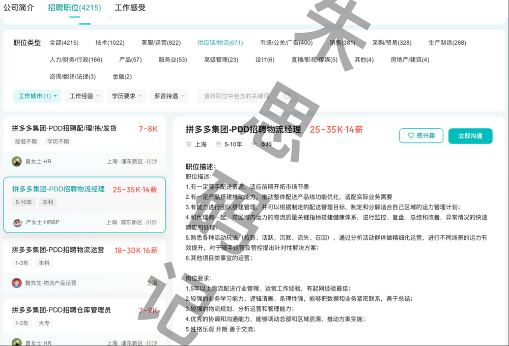 在某招聘网站上,拼多多招聘的4215个岗位中,涉及闪购行业的生产制造、采购贸易和供应链物流等岗位接近总比例的30%。