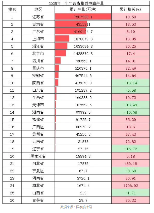今年上半年,甘肃省集成电路产量达到431.1亿块,增长18.53%,把老牌电子大省广东挤到了第三。