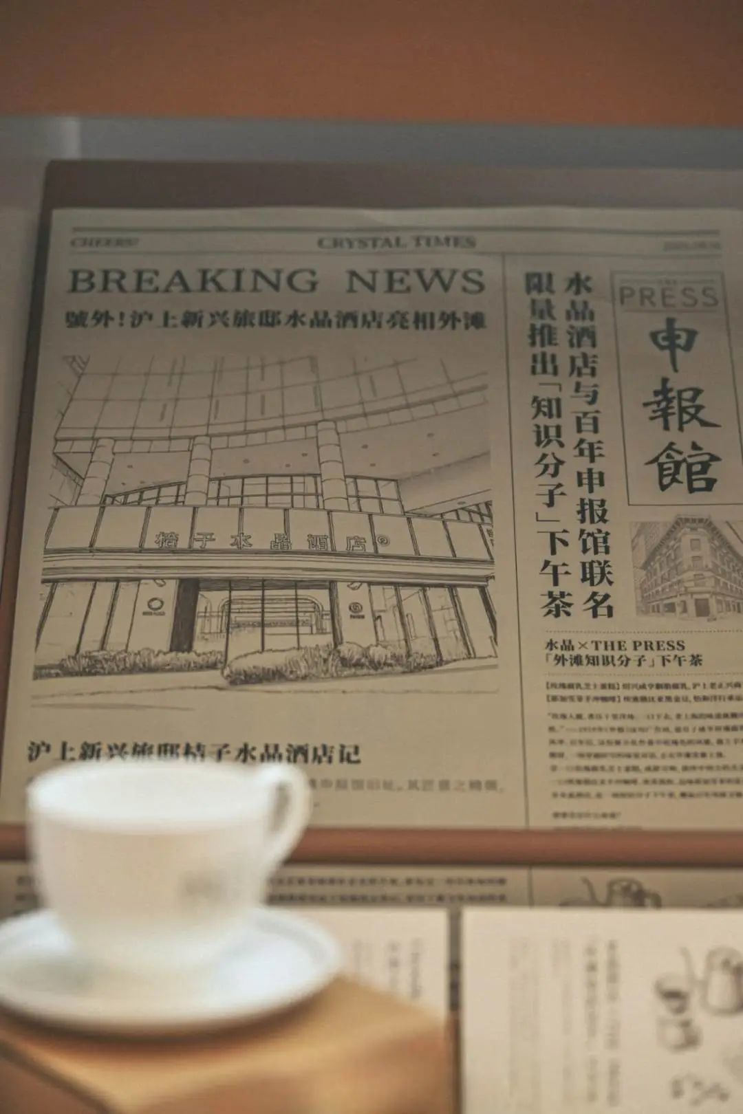 酒店大堂内闪现水晶酒店与申报联名的报刊亭,引得众人停驻,头版头条“號外!沪上新兴旅邸水晶酒店亮相外滩”更是模仿经典《申报》文风,观众直呼“太会搞事情了!”领一张水晶《申报》,这场百年时空穿梭之旅才不算白来。