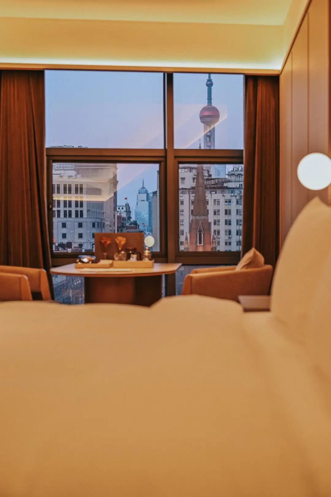 立于客房窗前,外滩的夜色在眼前铺陈开来。在水晶酒店,外滩是难得的另一种模样,圣三一教堂和东方明珠同框并立,它并非只有凌厉锋芒与霓虹璀璨的纸醉金迷。这一刻的外滩,更像一幅层次丰富的写意画,繁华与静谧、历史与现代,在黄浦江的两岸从容对话,予人一种奇异的安定感。