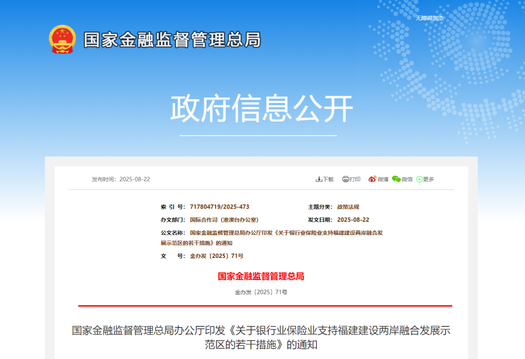 为贯彻落实《中共中央 国务院关于支持福建探索海峡两岸融合发展新路 建设两岸融合发展示范区的意见》有关精神,加大银行业保险业支持海峡两岸融合发展力度,近日,金融监管总局印发了《关于银行业保险业支持福建建设两岸融合发展示范区的若干措施》(以下简称《措施》)。