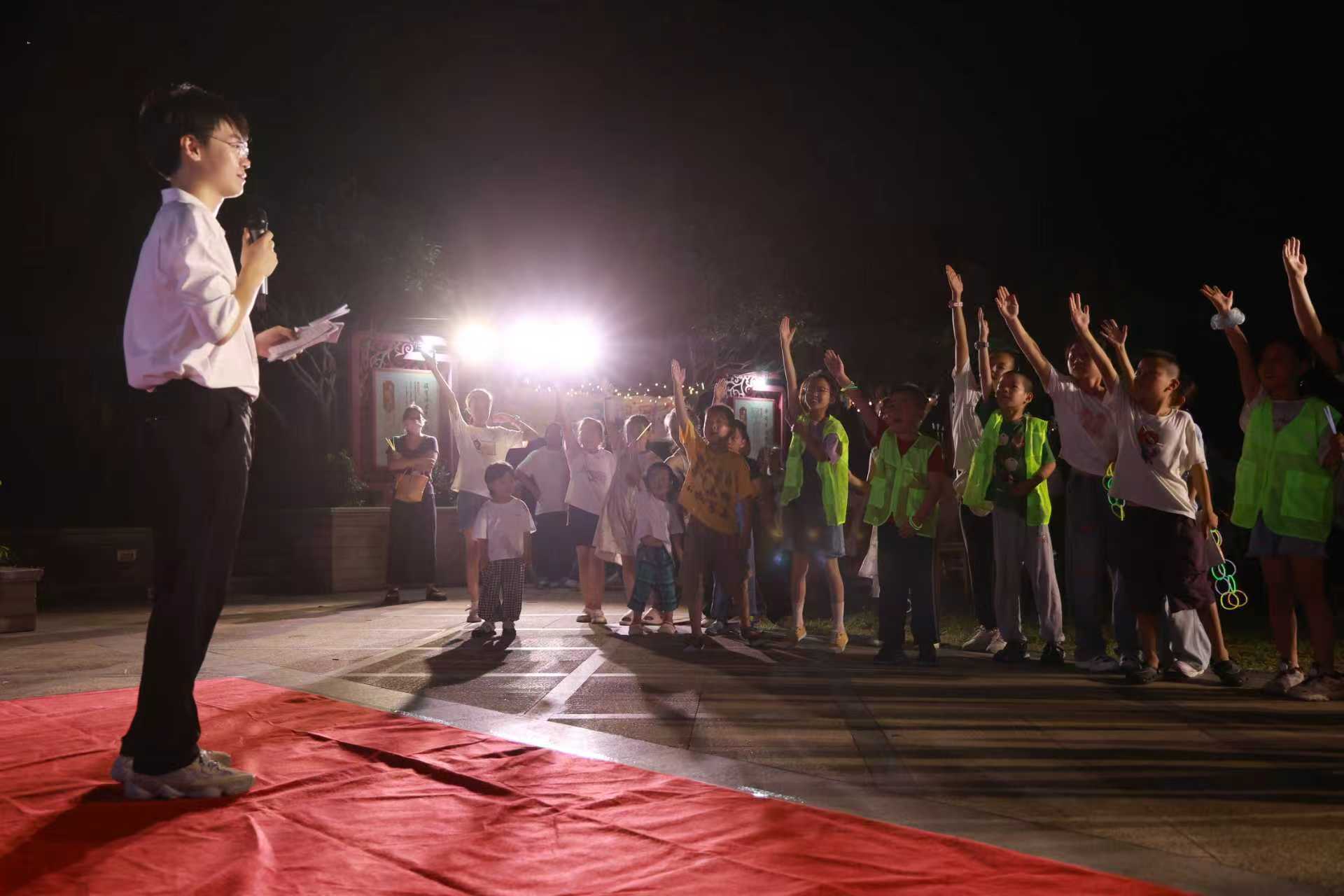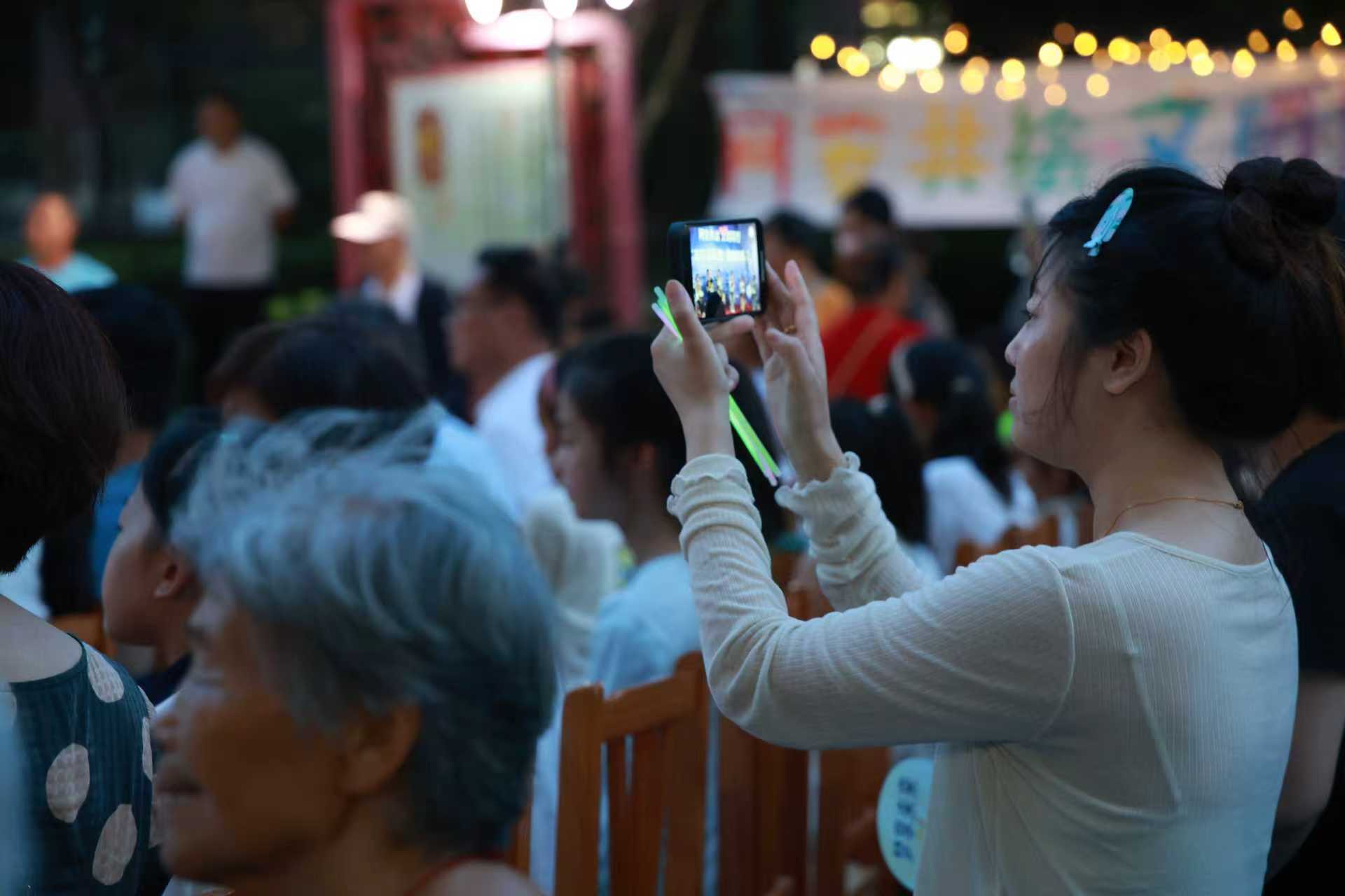 演出现场座无虚席,人头攒动,来自附近街区、社区的居民和小朋友们挥舞着手中的荧光棒,和台上的演员们同频共振,在阵阵欢声笑语中共度夏日夜晚的欢乐时光。