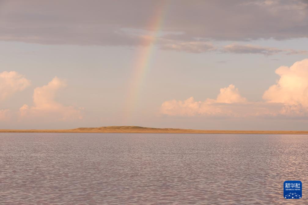 这是8月23日在哈萨克斯坦阿克莫拉州拍摄的科贝图兹湖上的彩虹。