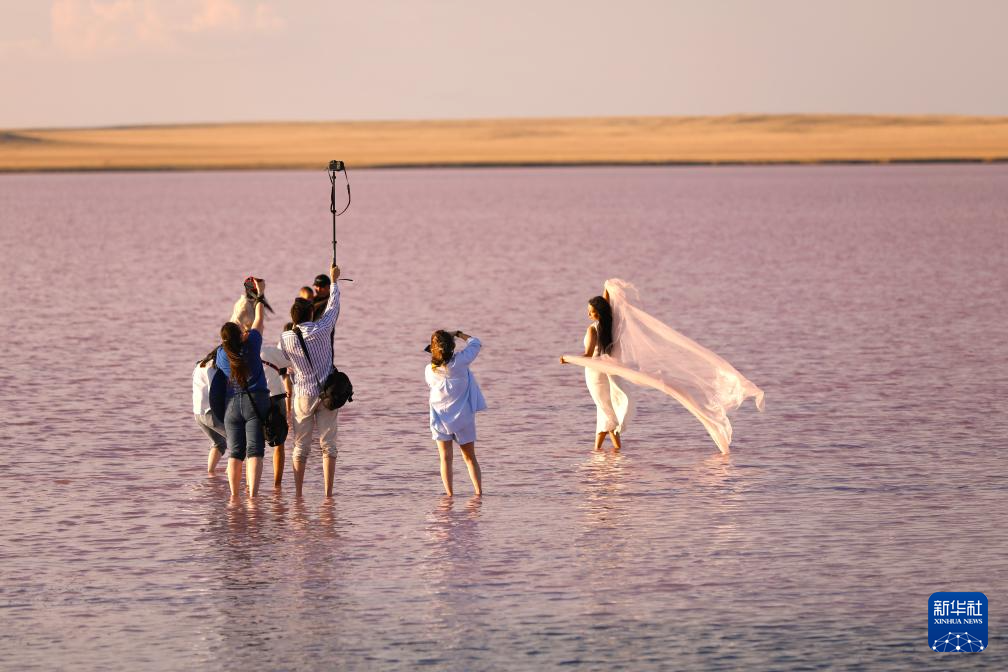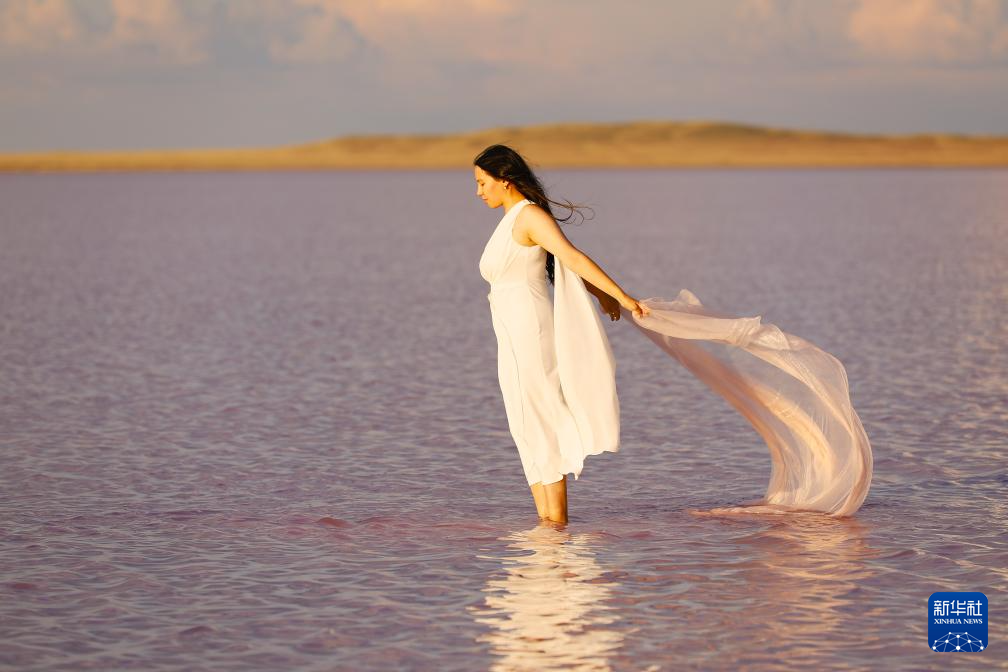 8月23日,在哈萨克斯坦阿克莫拉州,游客在科贝图兹湖中拍摄艺术照。