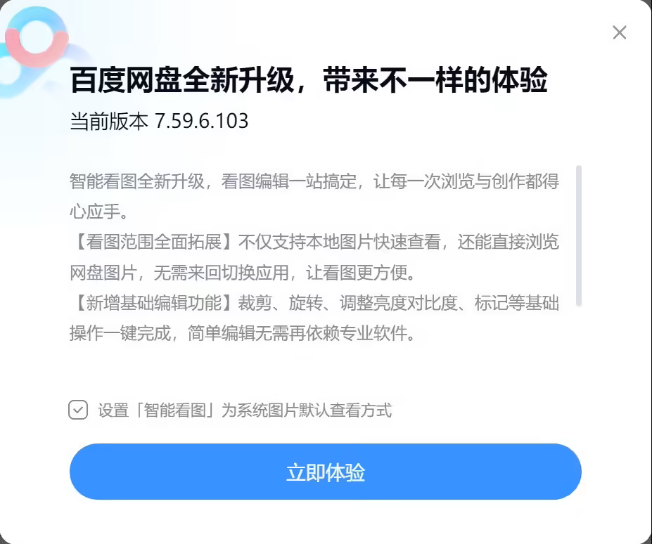 百度网盘最早是在 7 月 1 日(V7.58.0.108)新增了这一“智能看图”功能,但只有简短几个字;最后一次是在 8 月 21 日更新了 Windows 电脑客户端 V7.59.6.103 版本,宣布“智能看图全新升级”: