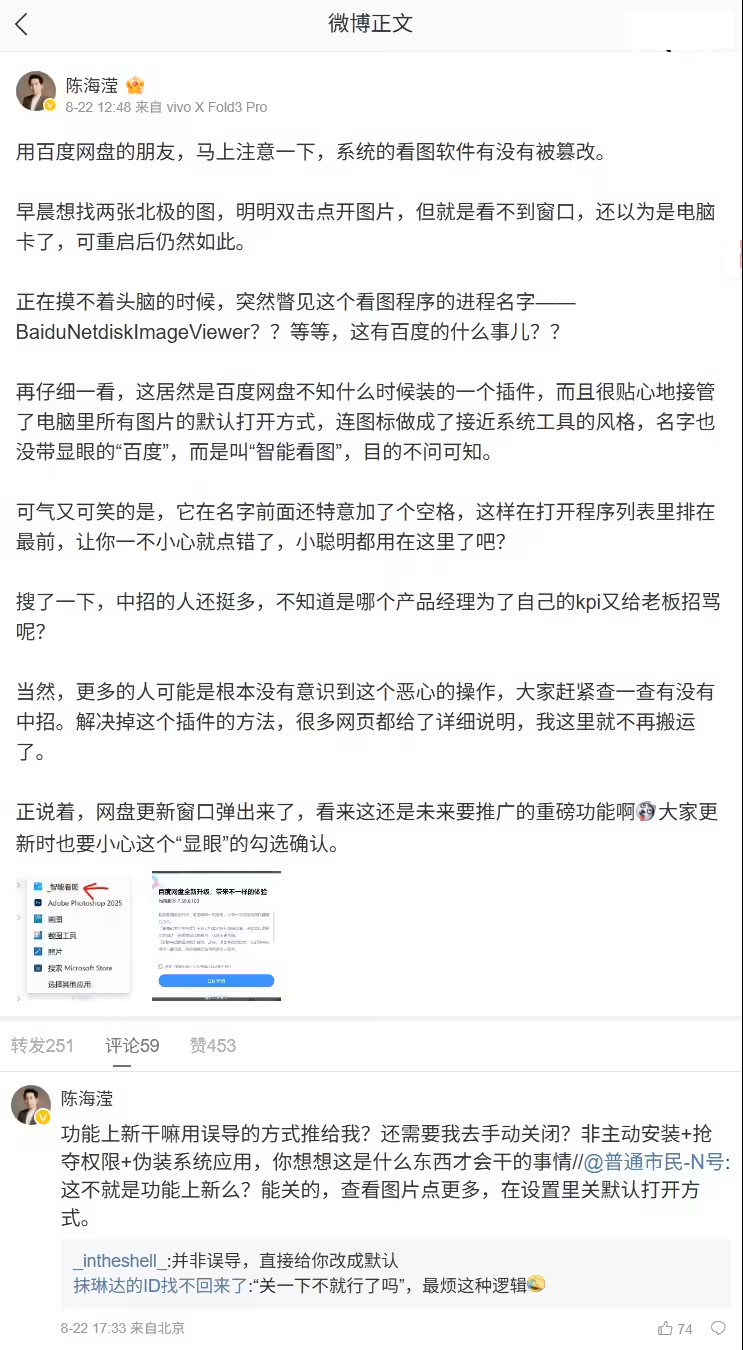 DoNews8月25日消息,据IT之家报道,摄影师陈海滢近日发微博吐槽百度网盘的“小聪明”,称其偷偷篡改了 Windows 电脑上的默认看图软件。他表示,自己打开图片后发现看不到窗口,重启依然如此,最后发现这居然是百度网盘不知何时安装的一个插件,而且它还很贴心地帮他接管了电脑里所有图片的默认打开方式。“搜了一下,中招的人还挺多。”