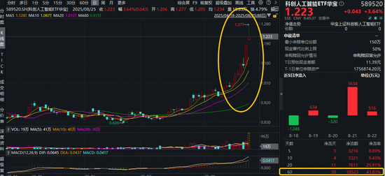 8月25日,国产AI产业链继续强攻!云天励飞涨超14%,航天宏图涨逾12%,奥比中光、芯原股份等个股大幅跟涨。第一大权重股寒武纪涨超4%,重点布局国产AI产业链的科创人工智能ETF(589520)场内价格一度飙涨超6.7%,现涨3.64%,继续刷新上市高点!实时成交额超3200万元,交投较为活跃!