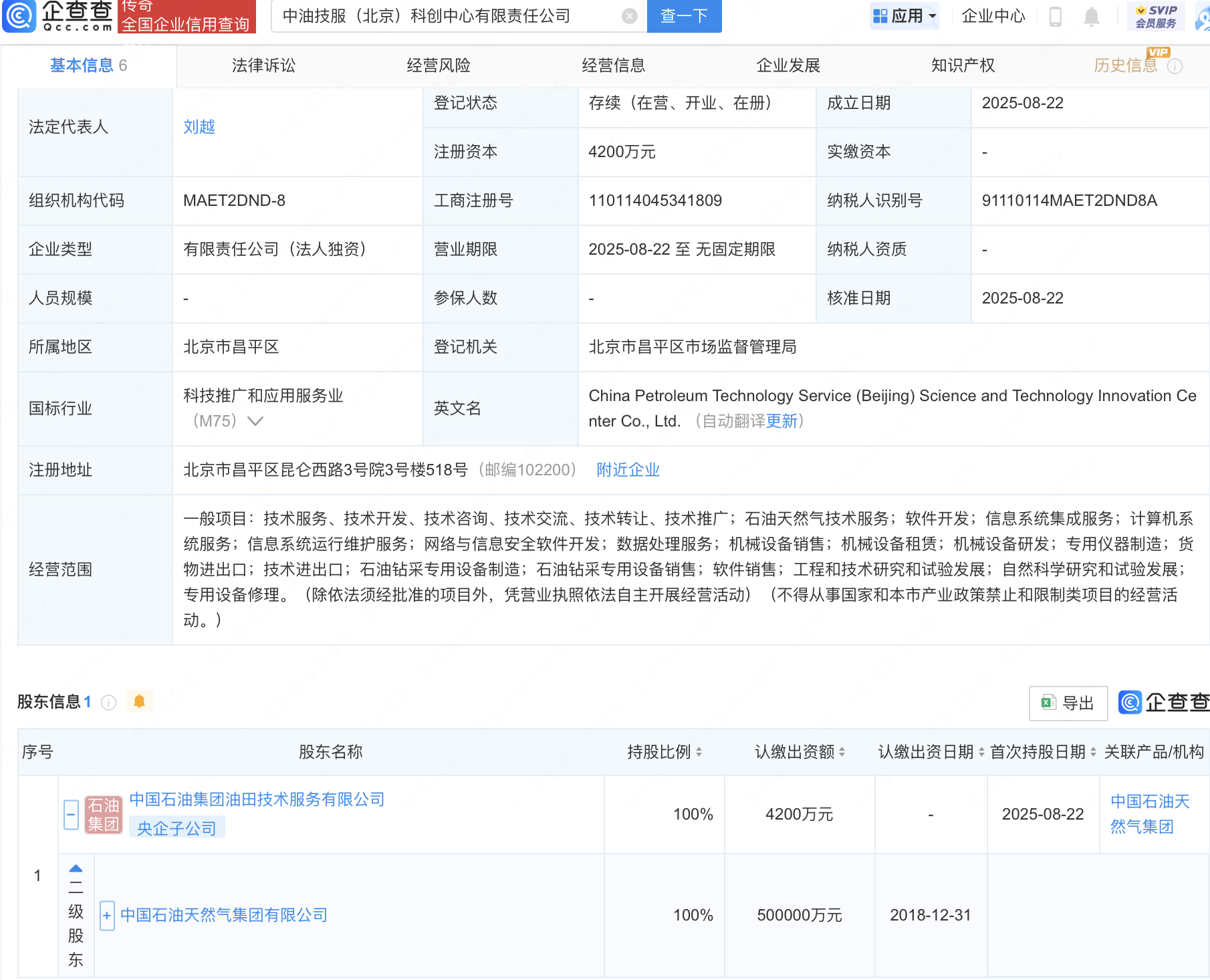 企查查APP显示,近日,中油技服(北京)科创中心有限责任公司成立,注册资本4200万元,经营范围包含:网络与信息安全软件开发;数据处理服务;机械设备销售;机械设备租赁;机械设备研发等。企查查股权穿透显示,该公司由中国石油天然气集团有限公司间接全资持股。