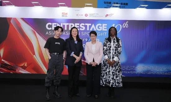 香港贸发局副总裁张淑芬(右二)、香港贸发局成衣业咨询委员会主席方淑君(左二)和英国驻港总领事馆贸易及投资总裁艾芷敏(右一)及本地设计师Angus Tsui(左一)于CENTRESTAGE新闻发布会分享展会精彩内容
