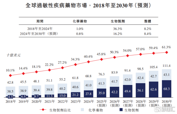 全球过敏性疾病药物市场规模已从2018年的428亿美元增长至2024年的688亿美元,复合年增长率为8.2%,预计到2030年将达到1114亿美元,该期间复合年增长率为8.4%。
