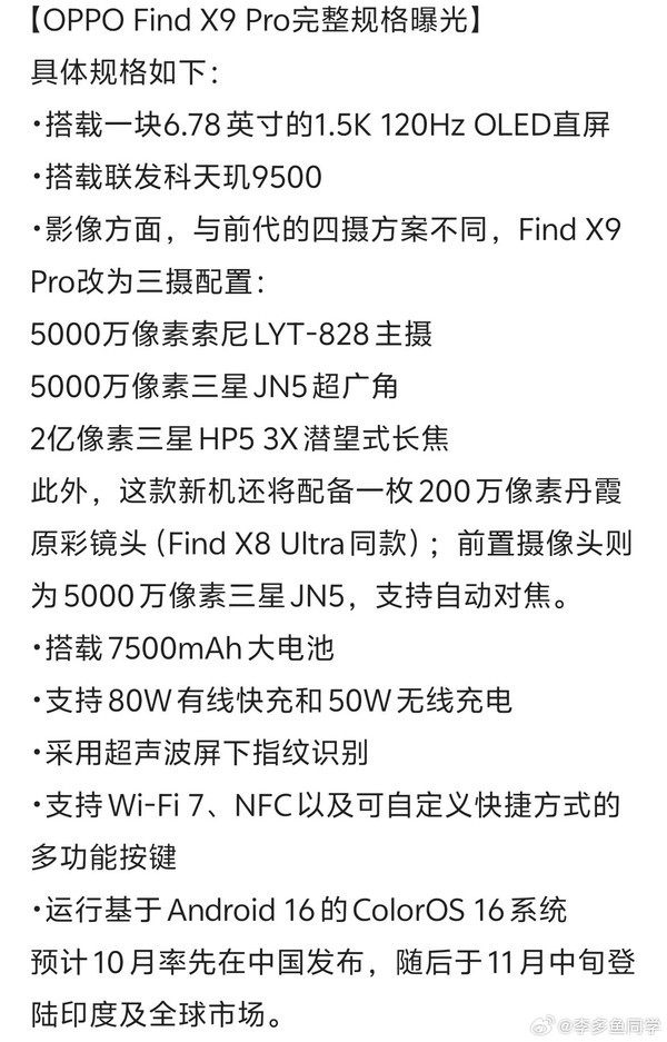 其他方面,OPPO Find X9 Pro有望内置7500mAh硅碳负极电池(部分爆料称7550mAh),较前代容量提升25%,支持80W有线快充+50W无线快充组合。还支持Wi-Fi 7、NFC及可自定义的多功能按键,运行基于Android 16的ColorOS 16系统,强化交互效率。