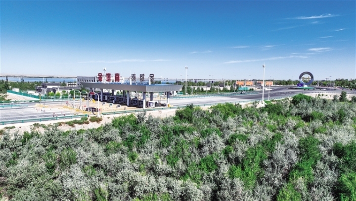 金塔县城南防护林呈现出一片绿意盎然的景象,与周边纵横交错的路网、波光粼粼的水库交相呼应,构成了一幅生态画卷。