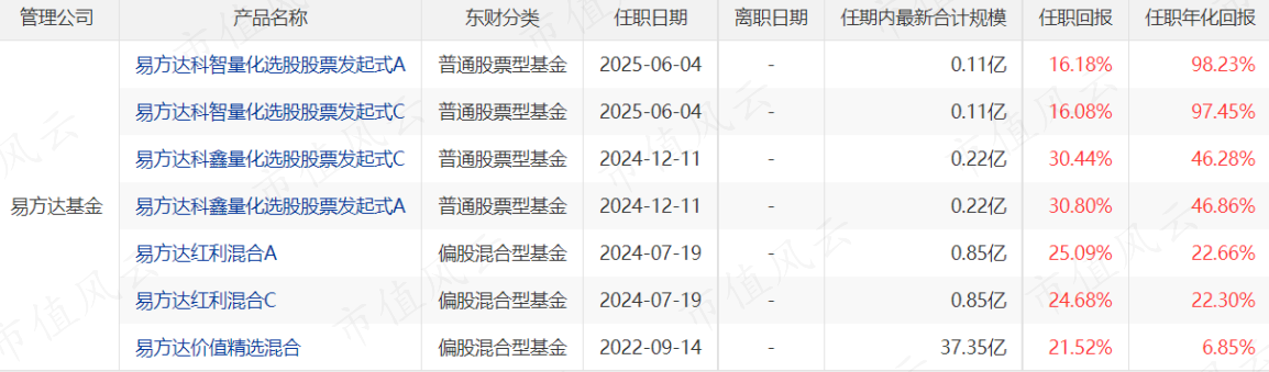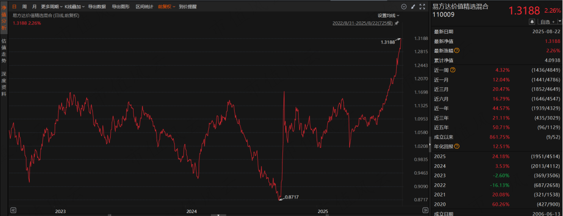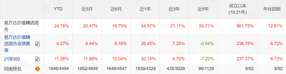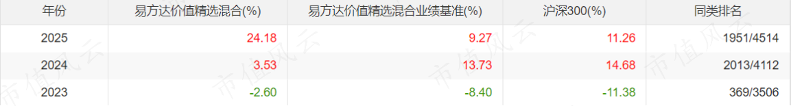 在风控方面,他的最大回撤控制仍需加强。截至2025年,他管理的易方达价值精选混合最大回撤超25%,表明在市场下跌期间净值波动较大。