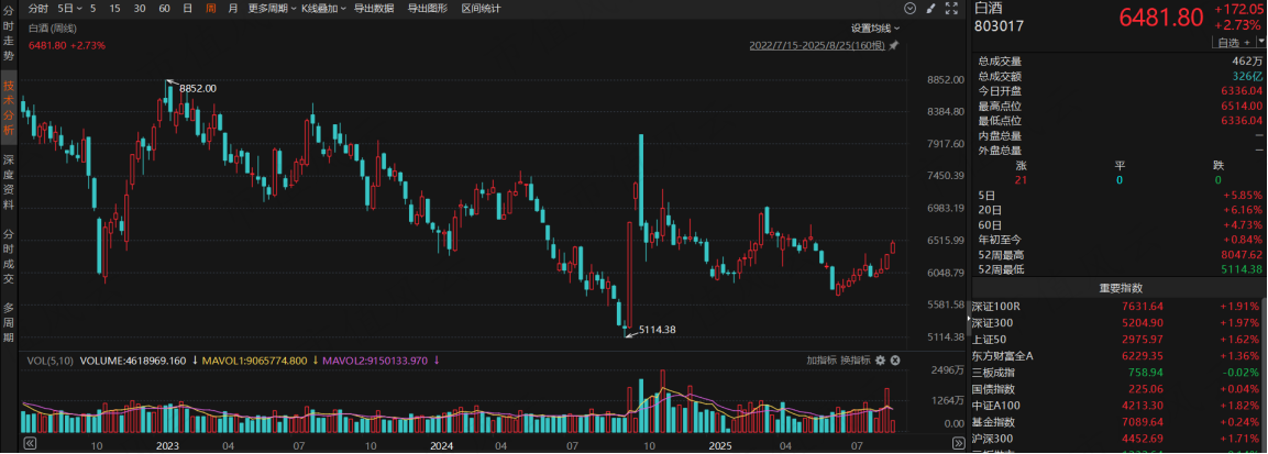 从彼时的行情来看,白酒指数在经历了2019~2021接连三年的上涨以后,已经步入了下跌行情,Choice数据显示,白酒指数自从2023年年初达到最高点后便一路下行,近三年跌幅为近25%。