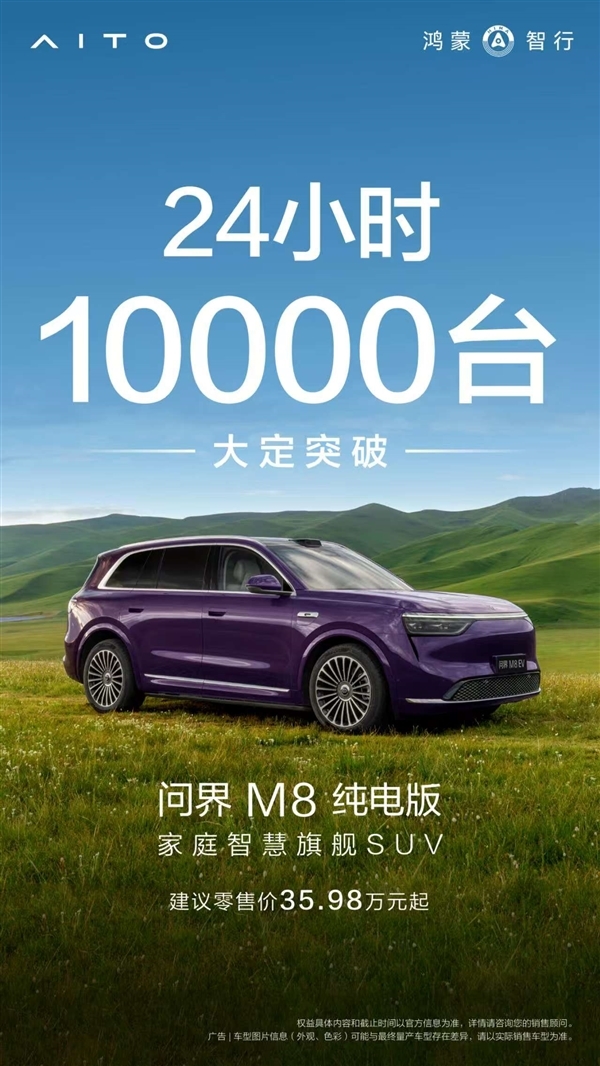鸿蒙智行官方宣布,问界M8纯电版上市24小时,大定突破10000台。
