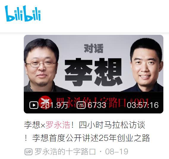 8月15日,自带流量和多重话题标签的罗永浩入驻B站,并宣布将开启一档视频播客节目《罗永浩的十字路口》,8月19日,罗永浩发布了第一条视频播客,与理想汽车创始人李想进行了近4小时的深度对话,一度引发热议,在B站内的观看量超230万。