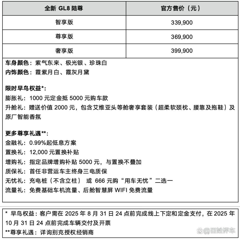2025年8月26日 今天,别克品牌宣布:豪华新能源MPV——全新GL8陆尊正式上市,共推出智享版、尊享版、奢享版三款配置车型,售价33.99万元~39.99万元。全新GL8陆尊全系均为豪华艾维亚版本,大幅提升豪华质感,并提供紫气东来、极光银、珍珠白三款车身色,以及霞紫月白、霞灰月黛两款内饰色的选择。定位“全家人的新能源头等舱”,全新GL8陆尊还搭载了更强大的“真龙”插混Pro系统,实现同级领先的1450km综合续航以及202km纯电续航,并带来MPV行业首个混动5C超充,以强大动力技术领航用户每一程。