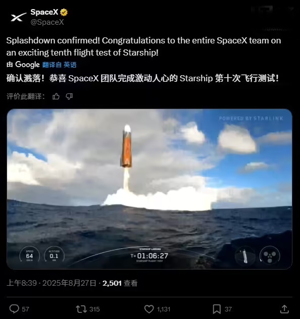 DoNews8月27日消息,连续两天推迟发射后,SpaceX 新一代重型运载火箭“星舰”于美国中部时间 8 月 26 日 18 时 30 分从得克萨斯州发射升空,实施第十次试飞。
