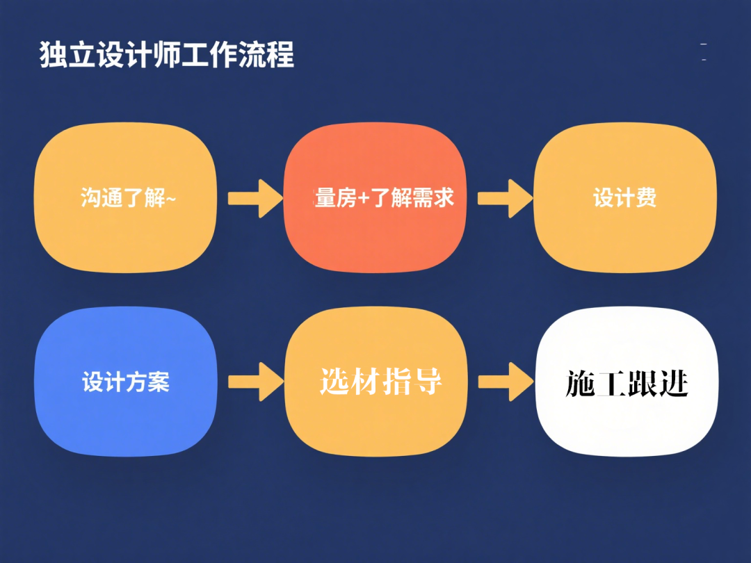 流程:沟通了解 → 量房+了解需求 → 设计费 → 设计方案 → 亲自跟进选材与施工。