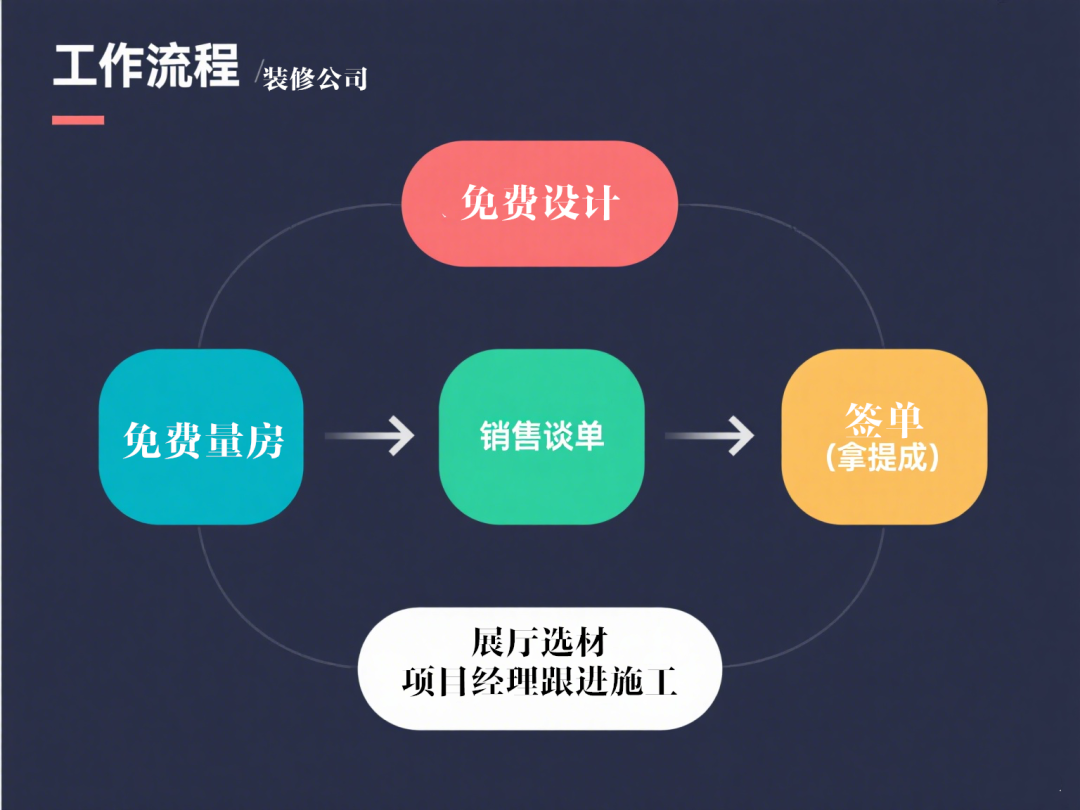 流程:免费量房 → 免费设计 → 销售谈单 → 签单(拿提成) → 公司展厅选材 → 项目经理跟进施工。