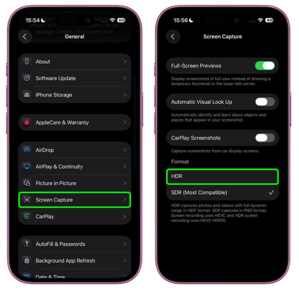 启用该功能的操作路径如下:进入iPhone的“设置”应用,选择“通用”,点击“屏幕快照”选项,在“格式”栏中选择“HDR”。设置完成后,所有后续的屏幕截图将以HDR格式保存,同时屏幕录制也将采用HEVC HDR10格式输出,确保动态范围和色彩表现的完整性。