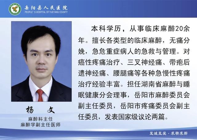 2000年,杨文大学毕业后,一直从事临床麻醉工作。25年来,他把知识用于实践,不断丰富自己的临床经验,同时,他深知医学无止境,分别赴湘雅附一医院进修麻醉,赴广州医科大学进修疼痛医学,只为不断提升自己的医疗技术,为患者带来更精准高效的麻醉服务,减轻病患痛苦。