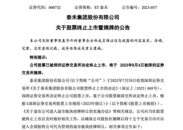 此后泰禾集团债务危机持续发酵,因连续多个会计年度财务指标触及终止上市条件,泰禾集团股票经历停牌、复核未果后,2023年8月,泰禾集团被正式摘牌,告别A股市场。