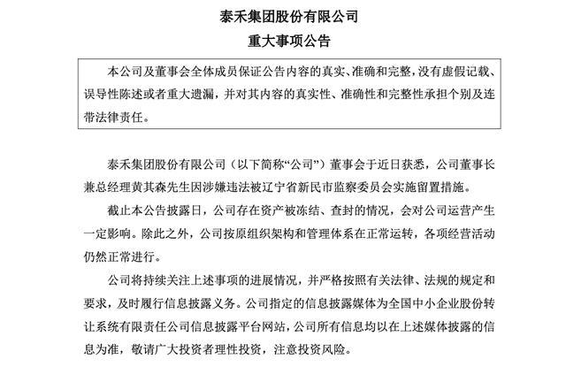 近日,泰禾集团发布公告称,公司董事长兼总经理黄其森因涉嫌违法被辽宁省新民市监察委员会实施留置措施。据《证券时报》报道,黄其森的具体违法行为涉嫌贪污贿赂、失职渎职等,监察机关已掌握部分违法犯罪事实及证据,仍有重要问题需要进一步调查,经批准可以将其留置在特定场所。