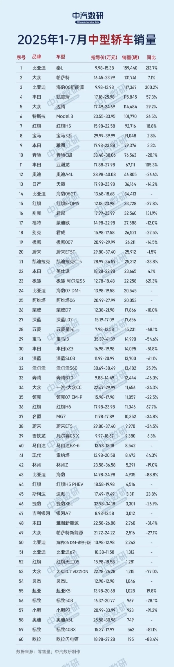 根据2025年1-7月中型轿车销量TOP60榜单,比亚迪成为最大赢家,旗下秦L(159440辆)和海豹06新能源(117367辆)分列冠季军,前者以亲民价格和性价比优势领跑,后者凭借新能源属性占据细分市场。传统燃油车领域,大众帕萨特(131741辆)和迈腾(114484辆)延续经典车型的市场号召力,丰田凯美瑞(115845辆)则以可靠品质稳居第四。