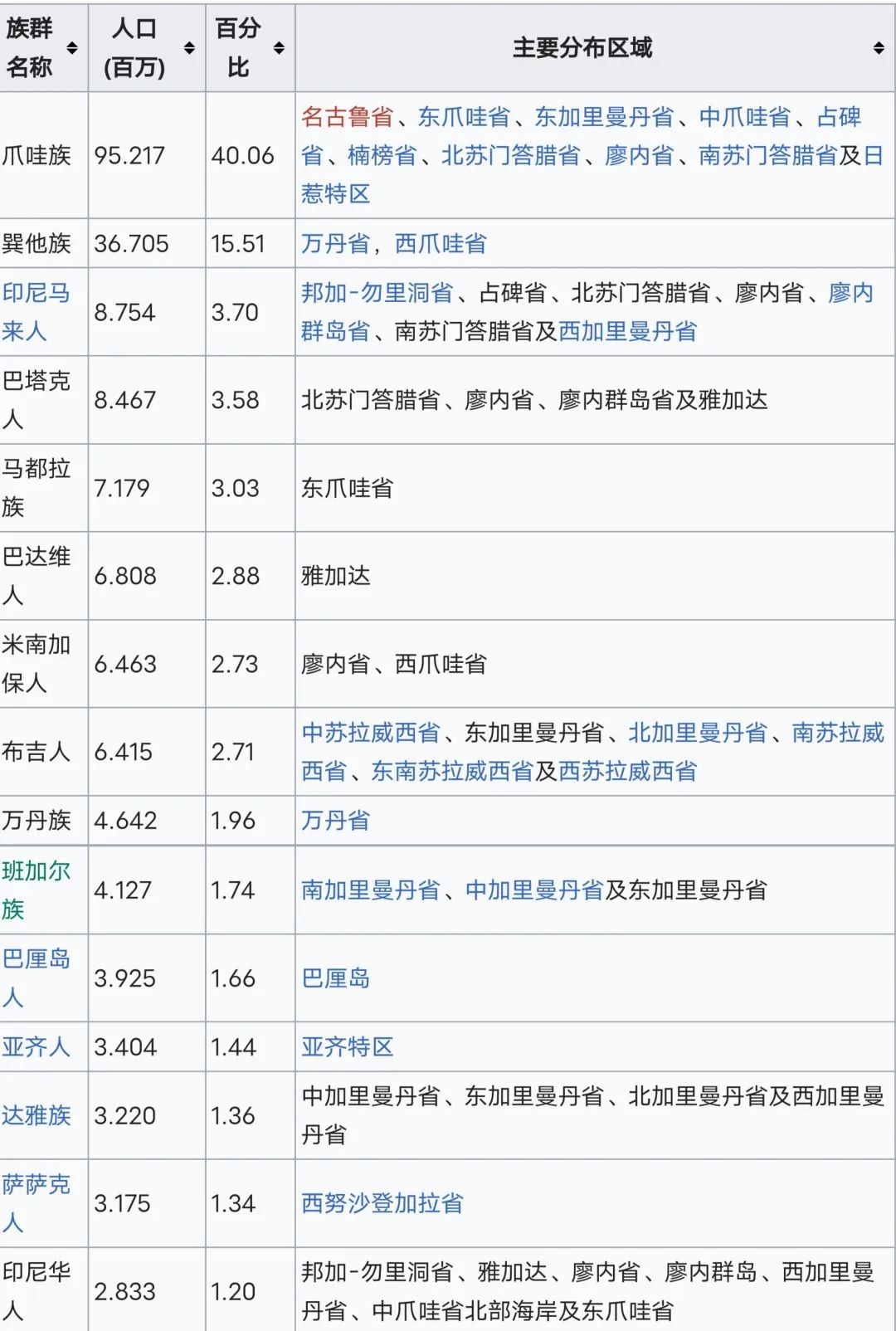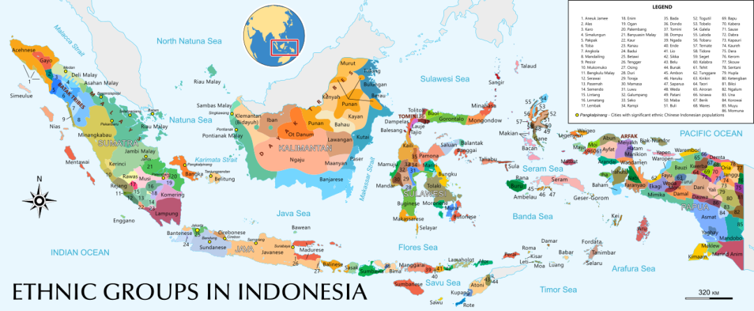 印尼是东南亚面积最大的国家,在1.7万座岛屿上生活着近3亿人口,被划分为约300个民族,最大民族爪哇族占总人口40%以上(约1亿)。